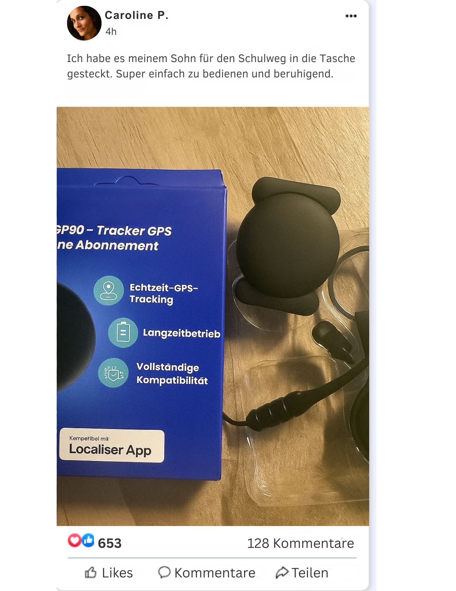„Ich habe den GP90 für die Schultasche meiner Tochter gekauft und bin sehr zufrieden. Die Ortung funktioniert zuverlässig und gibt mir ein sicheres Gefühl. Besonders praktisch finde ich die sofortigen Bewegungswarnungen.“